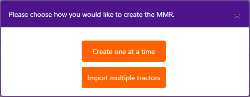 - On the Create page, a pop-up will appear asking if you want to create one at a time or import multiple tractors. This article only covers the feature "Create one at a time".