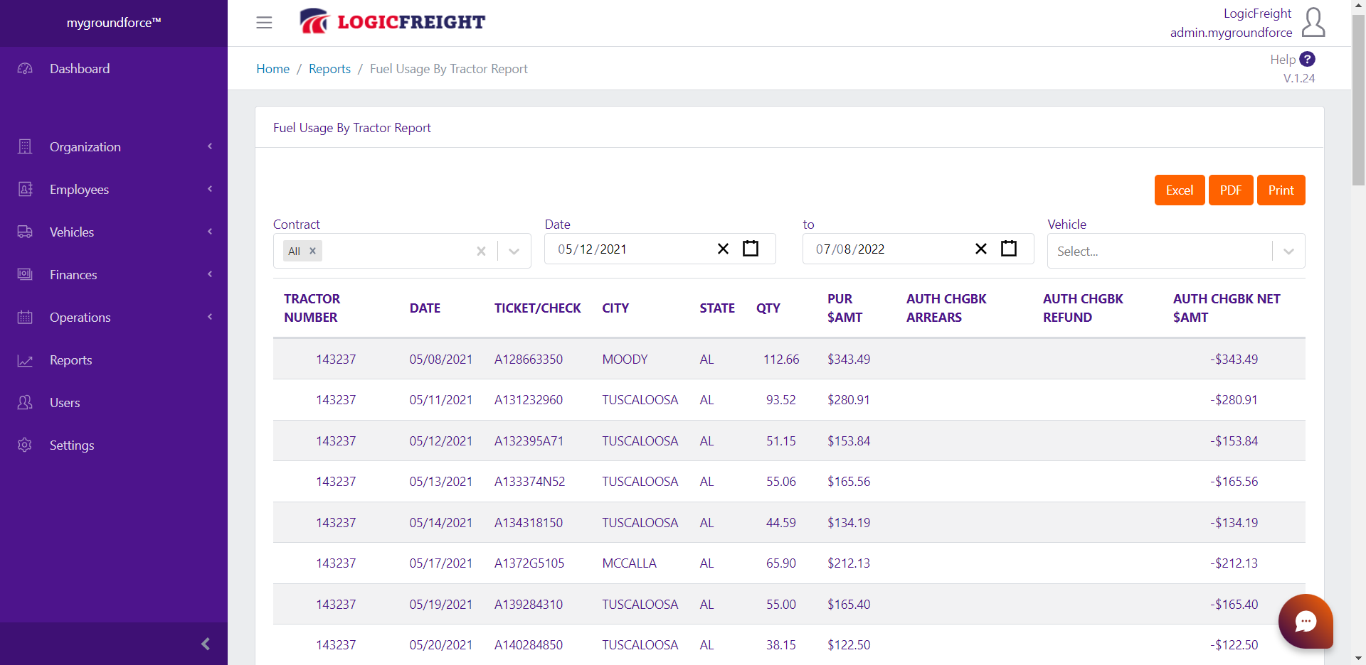 The Fuel Usage by Tractor Report shows you the fuel transactions from your FedEx Settlement. The Report also features the dropdowns Contract, Date (From / To), and Vehicle to filter the report's data.