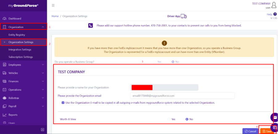 - On the Organization Settings page, under the company name (here as TEST) COMPANY), select the company and insert the e-mail address.