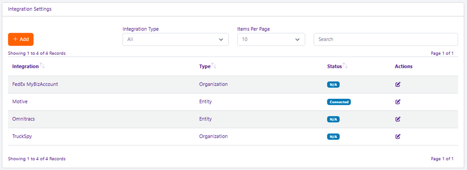 When accessing this page from Organization > Integration Settings, you will see a list of the integrations that you currently have added, from their name, to whether they’re set for a specific entity or an organization as a whole, their status and the Edit button to allow you to change the information within.