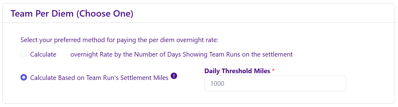 - Calculate Based on Team Run's Settlement Miles - All team Linehaul trips miles for this driver will be summed and divided by the daily threshold miles, rounded down to a maximum of 7, and then multiplied by the per diem overnight rate.