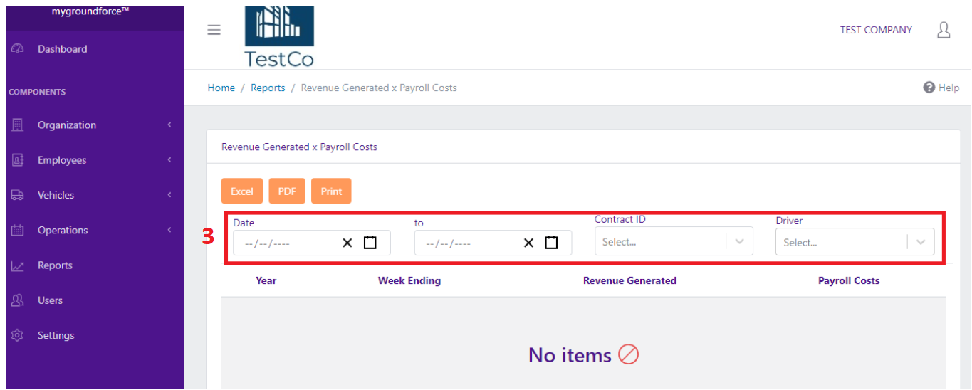 3. User the filter options Date (start date), to (end date), Contract ID, and Driver to refine your report data.