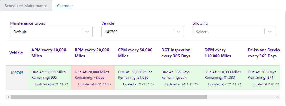 On the Calendar tab, you can keep track of all scheduled maintenance for all your vehicles or specific ones. Here is how to see specific vehicles' scheduled maintenance: On the left side menu of the screen, click on Vehicles. Under the Vehicles menu ...