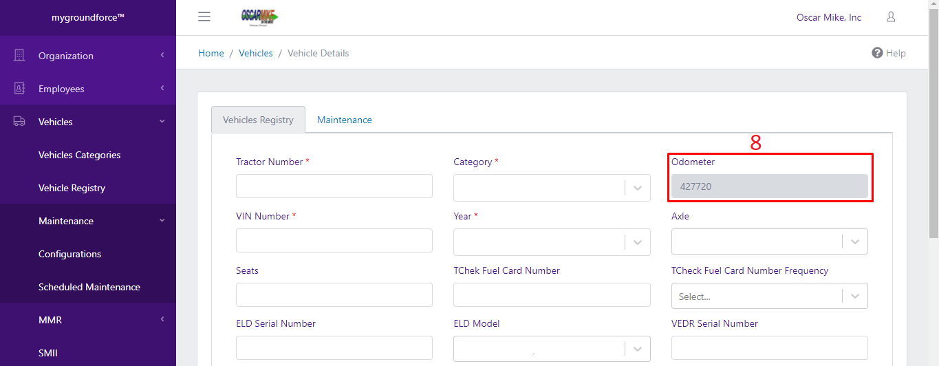8. On the Vehicles Registry page, in the Odometer field, enter the new odometer number and Save.